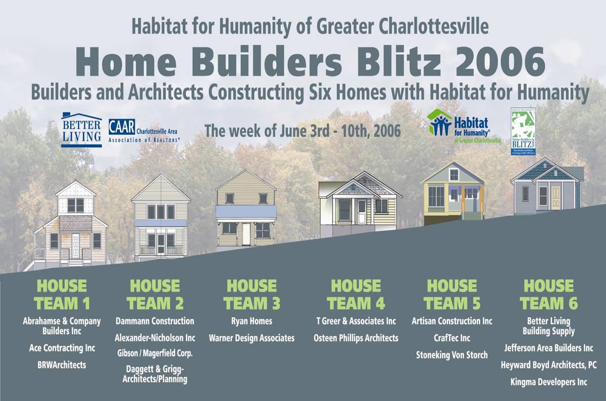 Home Builders Blitz 2006 will take place this summer, June 3rd – 10th. The formula is simple. Builder/Architect teams have been matched with house sites and qualified Habitat partner families in our program completing their “sweat equity” hours. In that week the builders will complete six simple, attractive and sustainable homes and the families will move in soon after to take up an affordable mortgage as homeowners. The homes are located in the Fifeville neighborhood of Charlottesville, an area consisting of 70% rental units.