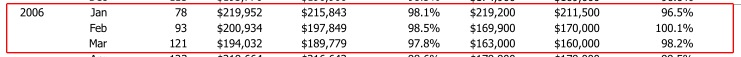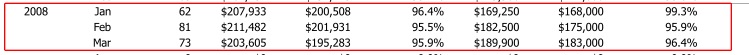 I apologize for the display issues; I am still working on reports from their MLS. In short, they did not have the same run-up in price or inventory that the Charlottesville market did. However, their market now has about seventeen months of inventory (PDF here) versus about five months of inventory at this time in 2007 and almost four months of inventory in 2006.