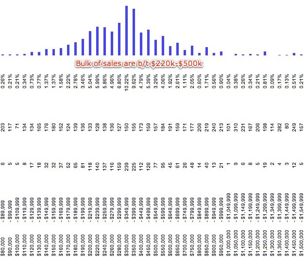 This is a great update. I love the histogram, and if you find some idle time on your hands, I think it would be wonderful to see several years – 2002 through 2008 – overlaid. Because the peak of properties is tightly bunched between 200-300k, and that’s hardly representative of the bulk of inventory, I predict things will remain very slow. Until sellers can get down into that range, assuming they can go that low, transactions will remain slow.
