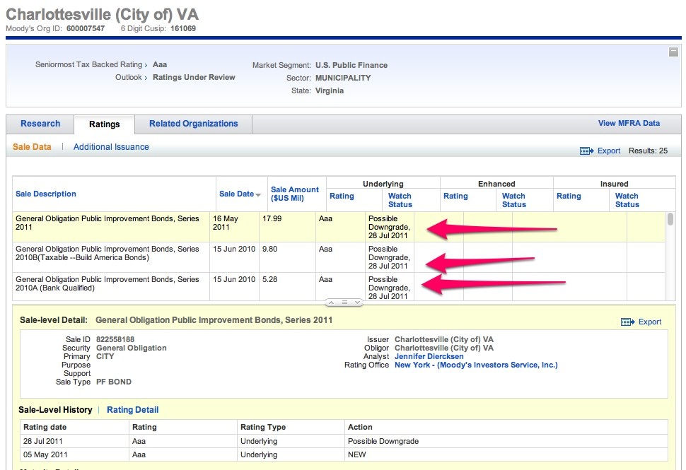 Moody’s reports that the City of Charlottesville is on its “Possible Downgrade” list: