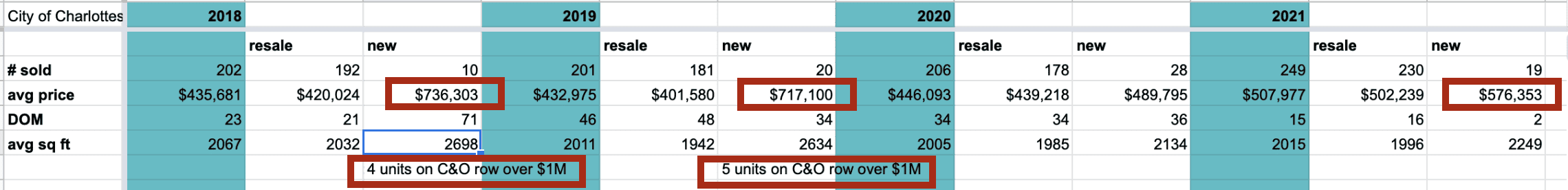 Why show that? Two reasons: 1) the new builds on C&O Row had a bit impact on average new construction pricing in 2018 and 2019 and 2) I knew something was amiss when I saw the huge delta between 2021 and 2019 (I worked backwards). There is value in knowing the market well enough to know when to look a bit deeper at the top-line data rather than just accepting what the “average” shows.